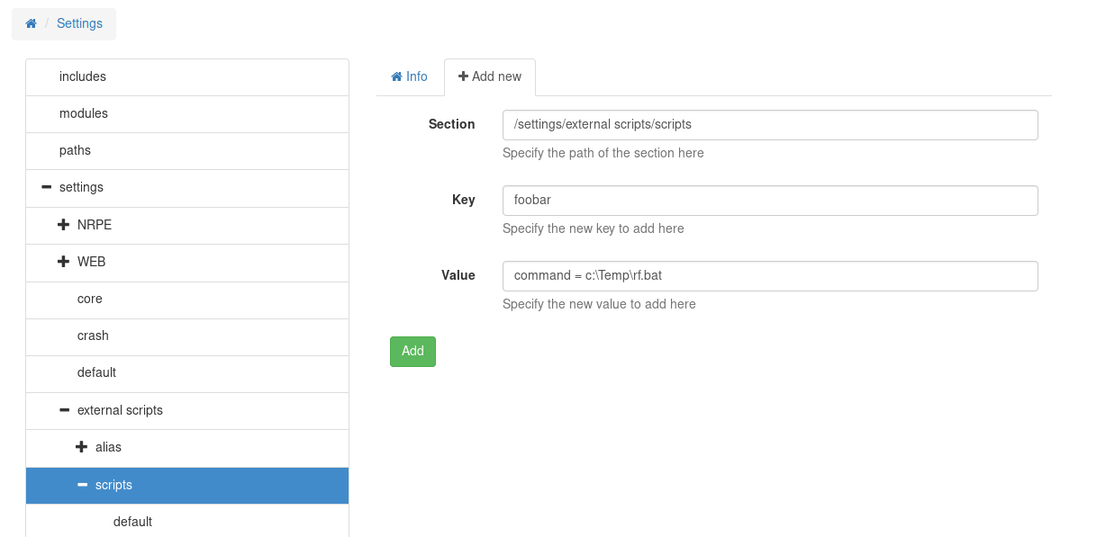 Now we need to add a script to the NSClient (Step 5 in the PoC). This will call our evil bat file.