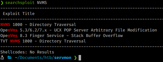 We know that the service being hosted on port 80 is NVMS. We can do a quick searchsploit for NVMS and see there are a few exploits that pop up.