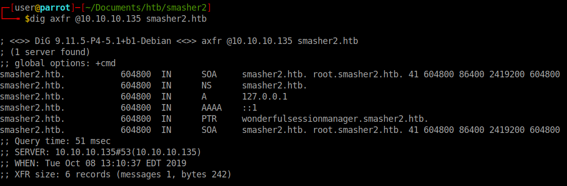 While that runs we can run nslookup against the machine to see what it might return. We see that smasher2.htb is indeed the hostname so we’ll add that to our hosts file. We’ll also want to dig against the host and see what data comes back.