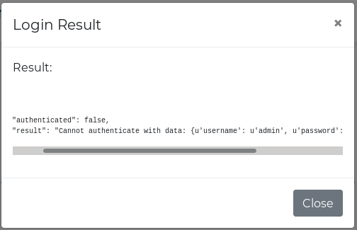 We do some manual enumeration of the site while we are on it. We try to login using admin / admin and get a failure box which happens to return JSON. This is likley the auth.py webservice.