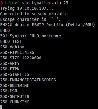Given we have such a large amount of email ports available we should try to see if we can spoof an email on the machine. We can test this by simply telneting to the port and sending a hail.