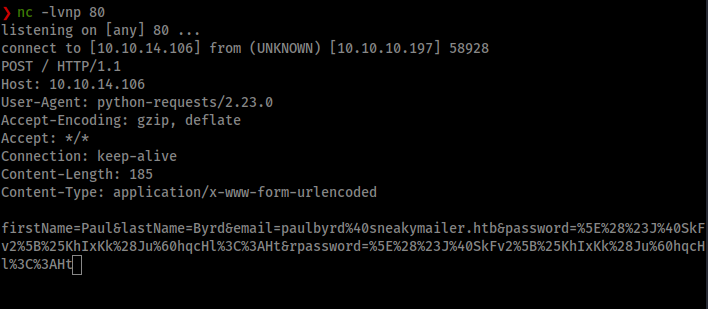 firstName=Paul&lastName=Byrd&email=paulbyrd@sneakymailer.htb&password=^(#J@SkFv2[%KhIxKk(Ju`hqcHl<:Ht&rpassword=^(#J@SkFv2[%KhIxKk(Ju`hqcHl<:Ht