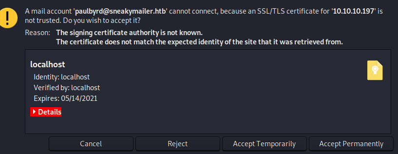 Once we’ve setup the account, it will attempt to login. We get a certificate erropr which is fine, we’ll accept it.