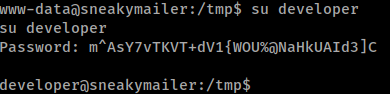 Next we can upgrade our shell to be more interactive. Let’s look around. First I’m going to grab a copy of linpeas and run it to see what that finds. Some interesting data comes back, like the .htpasswd for pypi.sneakycorp.htb. We’ll try to su to the developer account. It works.