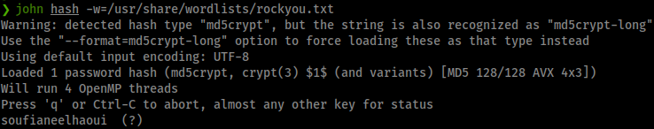 john hash -w=/usr/share/wordlists/rockyou.txt