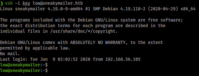 We get a warning saying this method is depreciated, but we also get a response of 200. So if all went well, we should be able to SSH in as low.