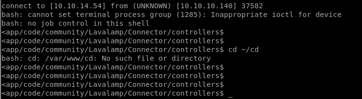 We start up our netcat to catch our incoming connections. Then head over to our uploaded path to kick the backdoor. http://10.10.10.140/app/code/community/Lavalamp/Connector/controllers/IndexController.php . Once we do, we see our Netcat light up!