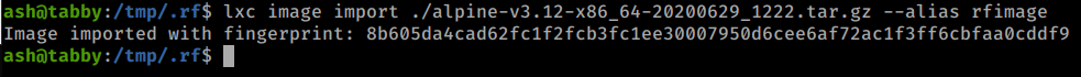 lxc image import ./apline-v3.10-x86_64-20191008_1227.tar.gz --alias rfimage