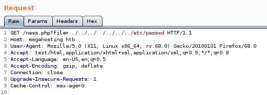 While those run we’ll check for some other basic things, like an LFI. We check the news.php location and sure enough, there is an LFI. We’ll load up Burpsuite to help with this one.