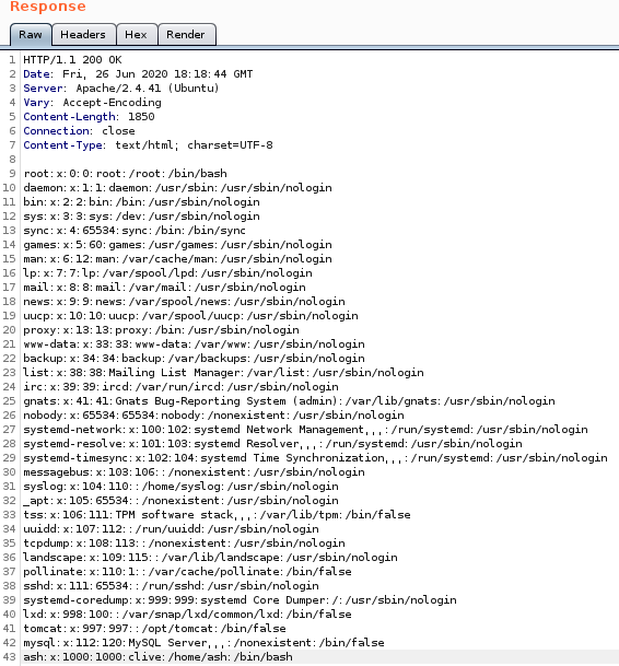 We send our LFI to the Repeater function and get the passwd file. We get this file so that we can get a good idea of the users on the machine.