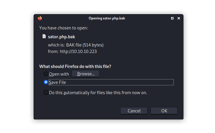 So, we should start looking for .php and .bak / .back files. As well as any items named sator. Since this list is small, we can check these by hand by checking our vhost and IP for these file names. The reason we do both IP and Vhost is because there are possibly more Vhosts than we know that could resolve to the IP.