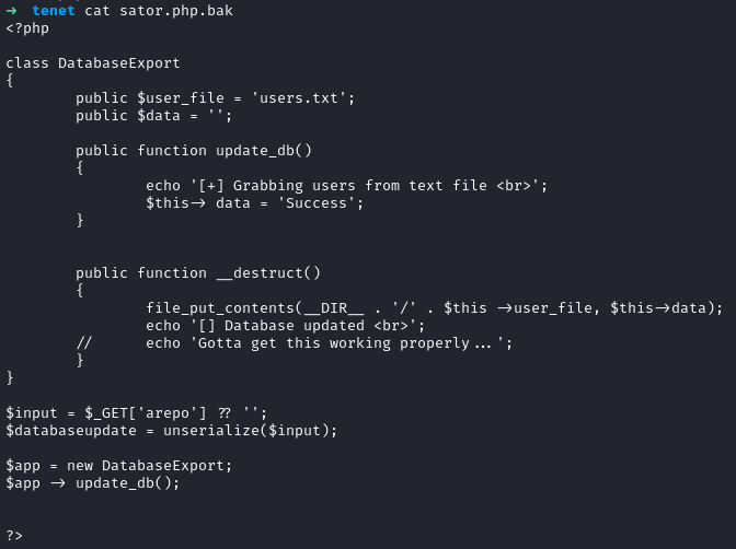 Looks like we’re taking a repo, arepo, which is serialized and unserializing it. Looks like we’re using a magic method here, __destruct(). PHP Deserialization is a common thing to see in HTB as well as other CTF’s. It’s also still realivant to real life applications (unfortunately). Here’s some more info on the topic: