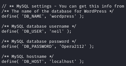 We get a shell back! Now we can start to look around and enumerate internally. Right where we land when we get a shell, we see a directory called Wordpress. Inside there’s the wp-config.php file, with credentials for neil.