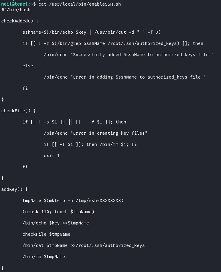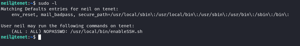 Now we can try to login via ssh as neil. It works, we’re in as neil and grab the users.txt flag! The first thing we always do once we get a user foothold on a box is sudo -l. This gives us an idea: