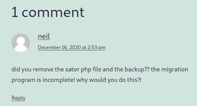 The enumeration shows us that we’ve working with a Wordpress site. Digging around gives us two users, protagonist and neil. Neil gives us one comment in particular that is interesting: