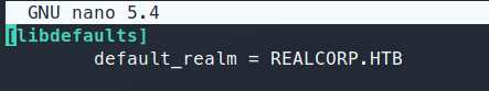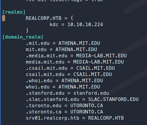 We need to edit a few lines, first our default_realm, that needs to be our target domain, REALCORP.HTB. Next we need to add a new realm of REALCORP.HTB. Then add the domain_realm for this domain. All in all these are what the modified lines should look like: