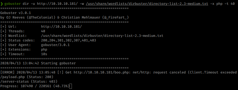 gobuster dir -u http://10.10.10.181/ -w /usr/share/wordlists/dirbuster/directory-list-2.3-medium.txt -x php -t 40