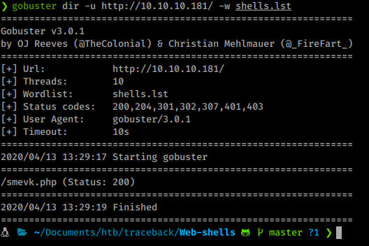 Now that we have a shells listing, we send this file to gobuster for discovery.
