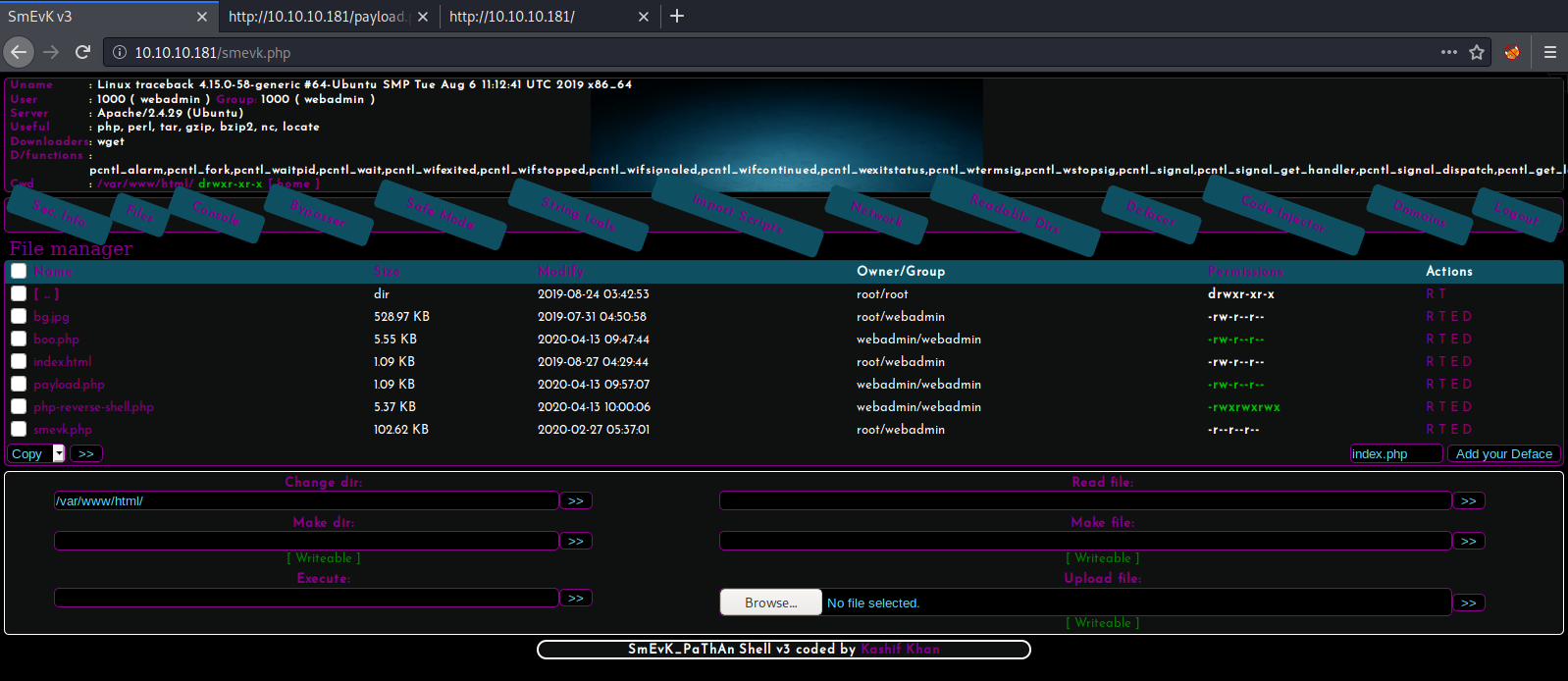 Sure enough we get one! smevk.php. If we examine our shell file locally, we see the default password of admin:admin. We use it and log in.