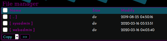 Well this is fun! Taking a look around the system using this interface we see there are two users, sysadmin and webadmin.