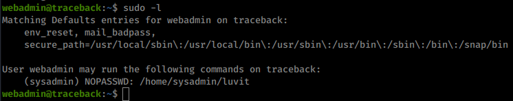 Once we’re in we look around but find no user.txt. Looks like we’ll have to move up another user to sysadmin to gain that key. We start our enumeration with the sudo -l command. This will tell us if we can run processes as other users. We also download linpeas and pspy64 as well.