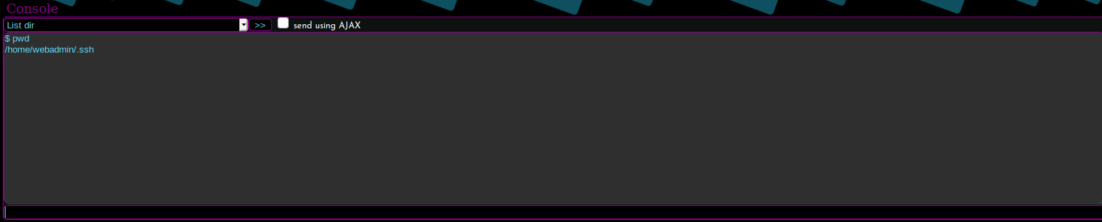 Great, we have a new keypair. Now we want to take our id_rsa.pub file and put it into the authorized_keys file on the remote system. Luckily for us, this awesome webshell will allow us to do that. At the top of the shell there is a console function. We click on it and are able to issue commands. We’re going to echo our key into the authorized_key file and verify it worked.