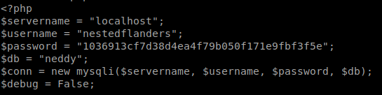 Now lets see if we can access mysql in this shell. mysql -u nestedflanders -p1036913cf7d38d4ea4f79b050f171e9fbf3f5e